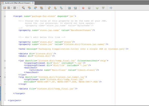 The property store.jar.name specifies the name of the JAR file that will be created in the store directory — change the value to whatever name you like. After you have changed this name, save the build.xml file. Figure 3 shows the additions to the build.xml file for the sample MarsRoverViewer project relative to the closing </project> tag.